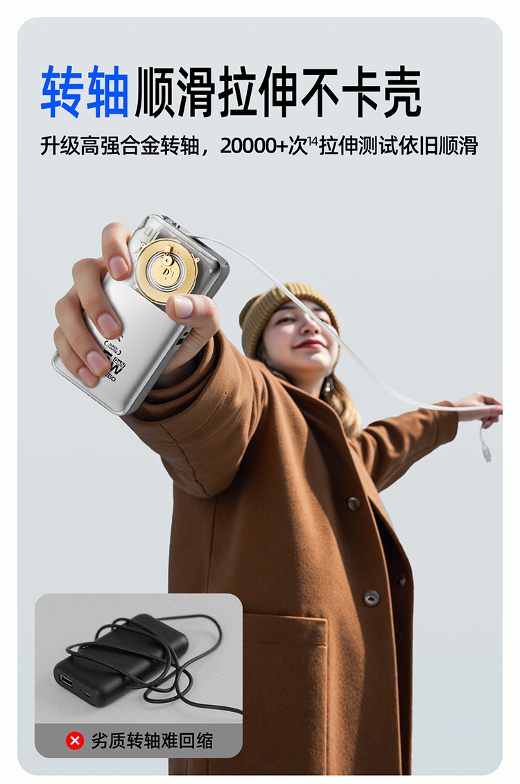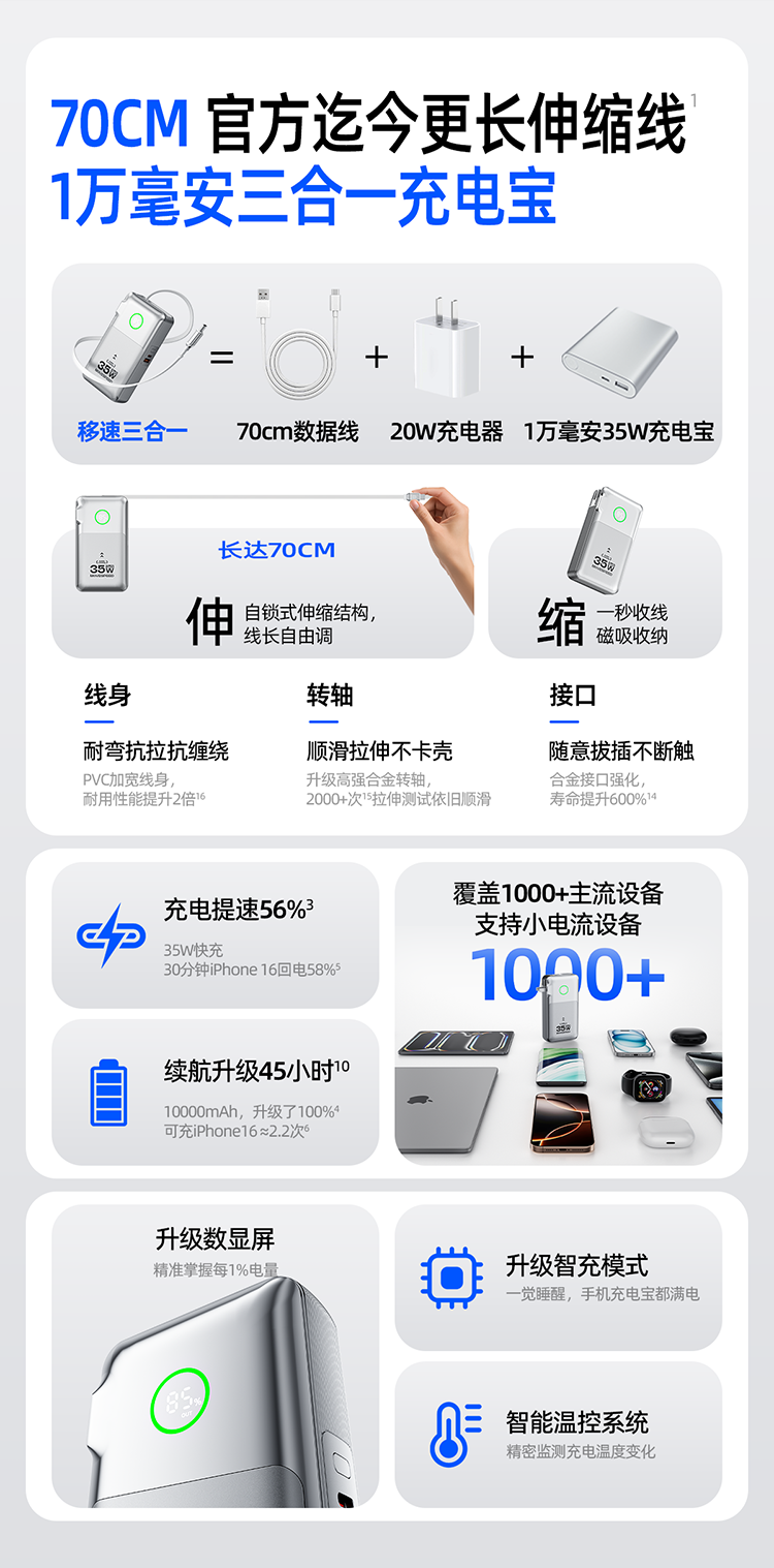 【联通官方】移速10000mAh 三合一充电宝自带伸缩线插头